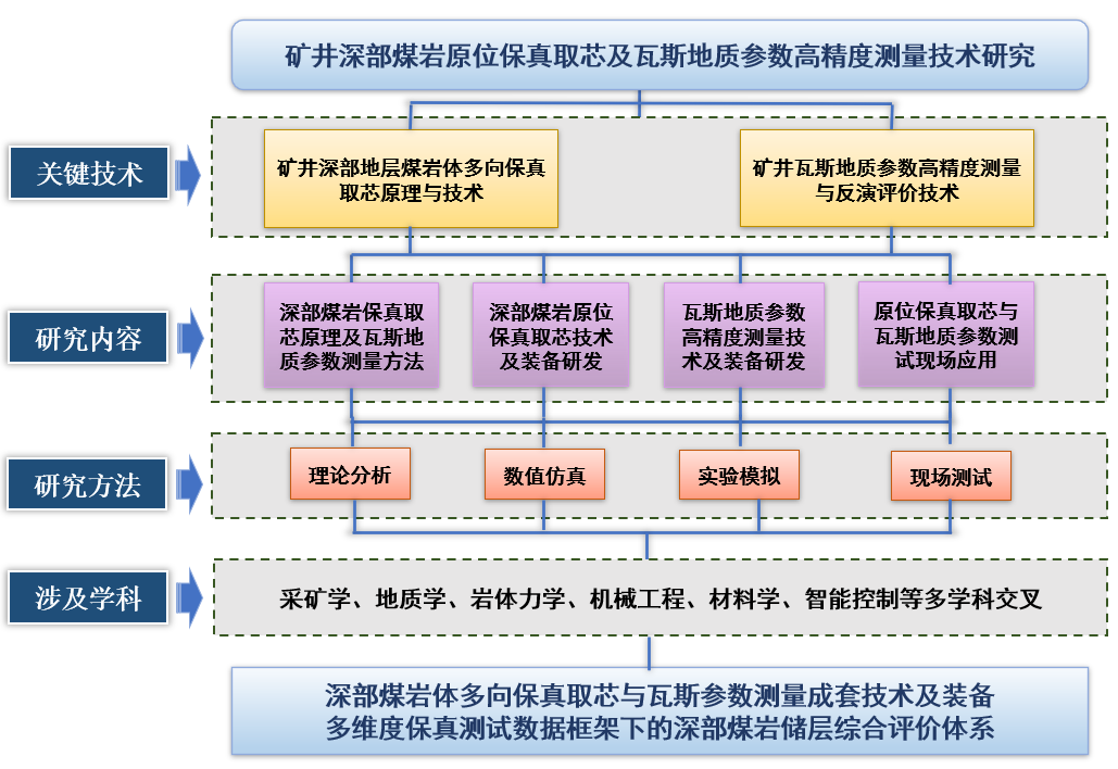 项目拟科学提炼矿井深部煤岩体保真取芯原理与技术、瓦斯地质参数高精度测量与反演评价等关键科学技术问题,从“原理构想-理论建模-模块化功能设计-装备集成验证-现场示范应用”出发,系统开展四大研究内容:深部煤岩保真取芯原理及瓦斯地质参数测量方法、深部煤岩保真取芯技术及装备研发、深部煤层瓦斯地质参数高精度测量技术及装备、深部煤岩保真取芯与瓦斯地质参数测试现场应用。